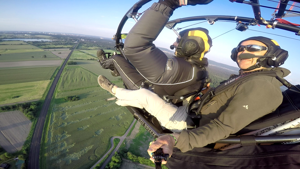 Mit dem X-Citor fliegen wir in einer Höhe zwischen 300 m und 1000 m Höhe. Dort ist es ungefähr 1°C je 100 m kälter. Bei sommerlichen Bedingungen ist so nicht einmal ein Overall erforderlich.
